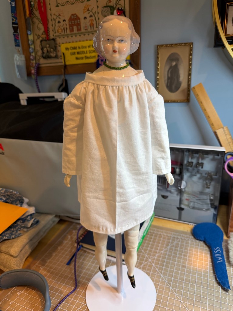 And since Martha is another 20” doll, I’m going to try using my sewing machine for parts of the clothing. Of course no setting in sleeves, they are just too small for my sanity, but much of the rest of the garments can be machine sewn. That should save my eye sight a little bit.