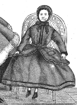 The doll is 48 centimeters tall, head not included. Her dress consists of a dress and a coat in gray lindsay. The overcoat, sleeveless, is retained by a belt. The skirt is 32 centimentres in length, 1 meter 50 centimentres wide; it is bordered with two bands in blue cotton velvet. Same trim for the sleeves and the collar of the bodice, whose figures 46 to 50 represent half. The belt clasps under a rosette. The overcoat is made from Figures 51 to 53; we put small pockets in it. The blue taffeta hat is made of stiff gauze, according to Figs. 54 and 55, furnished with archal thread, covered with taffeta, adorned with hives underneath, black lace on top.