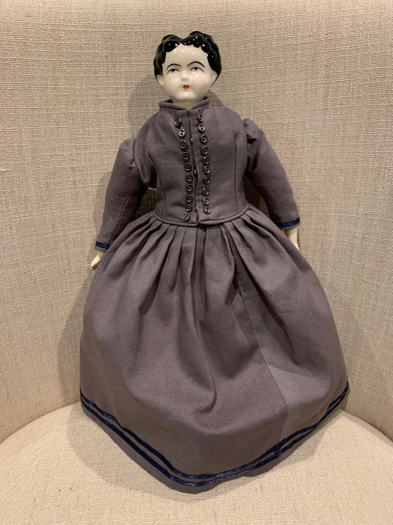 I decided to create a walking dress, or costume du promenade. It was described as being made from gray lindsay- a type of fine wool – with navy blue velvet trim. The original patterns were intended for a doll a bit larger than Nell, so I had to be careful to size it to her. I did not use wool because I don’t want to afford it for a doll, plus the majority of modern wool available at a big box retailer is a blend with a synthetic fiber to keep costs down and/or is heavier than I would need for a 12” doll. I substituted a nice cotton with a firm hand but fine weight.