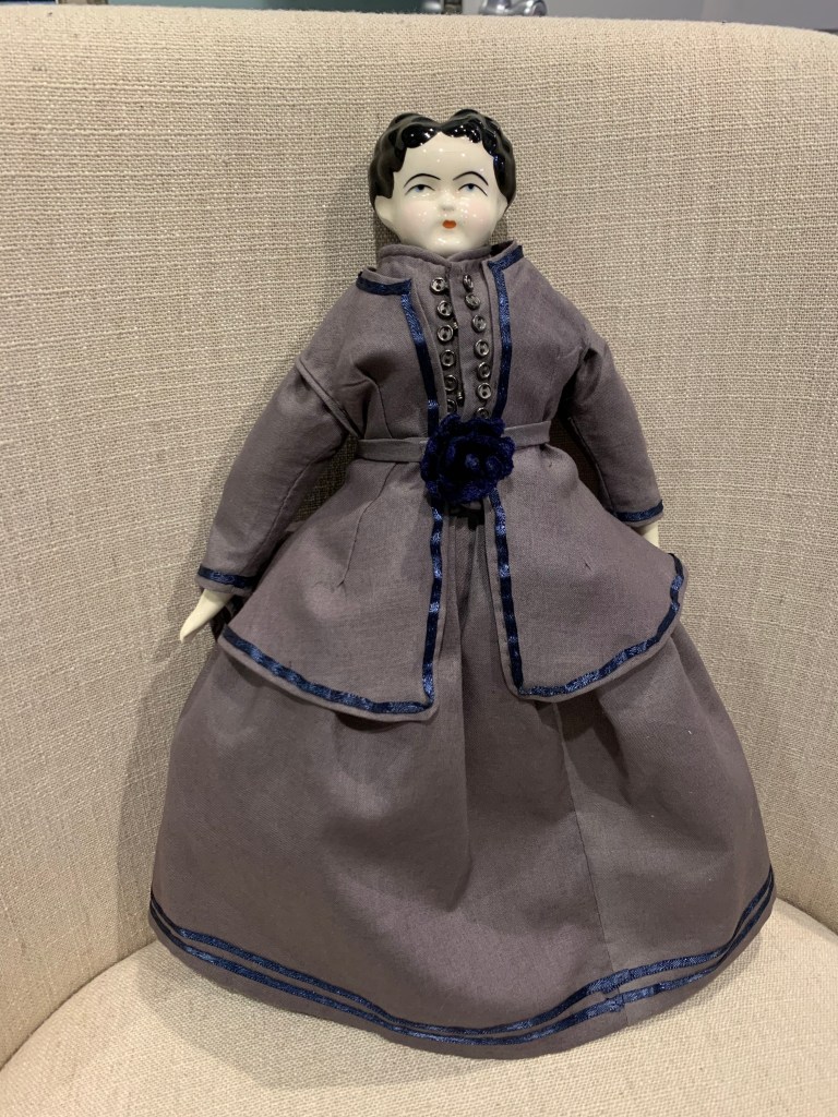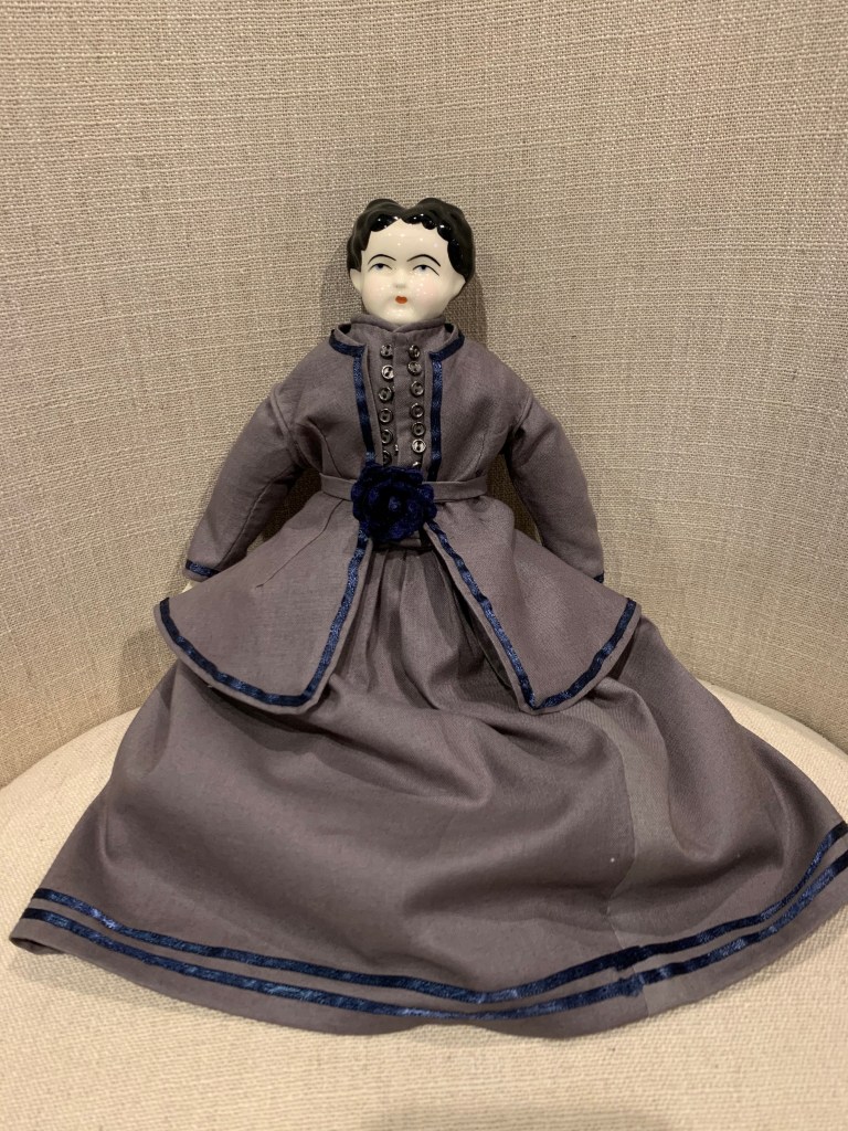 So here she is in her completed 1866 Promenade Costume. The dress includes a dogleg opening in the front, which requires careful attention to detail to ensure it stays centered. The bodice is darted as was appropriate in the era. While it shows 20 (count them all!) tiny, 5 mm buttons, they are nonfunctional and only for looks. This wasn’t unheard of in the 19th century either. I sewed on the buttons, which were squirrely to say the least, didn’t like how they looked, took them off and sewed them on again. I wound up sewing under the magnifying glass because they are tiiiiny. For reference, Nell is around 12″ – the height of a Barbie doll.