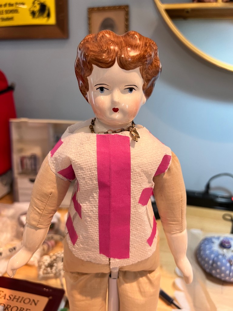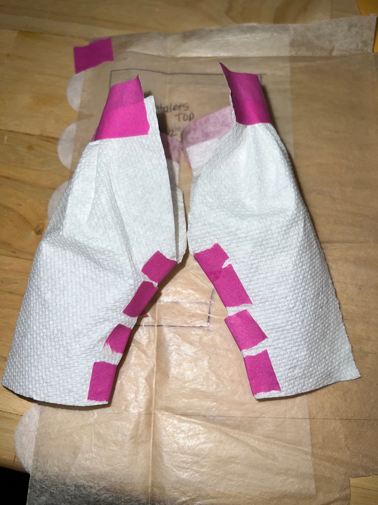 As I worked through the details of fitting pieces to her, I asked myself if I really wanted to make mock up after mock up in muslin, and the answer was “no.” The book suggested a paper towel mock up, and this has become my new favorite way to test doll patterns! Oh my goodness, it’s such a time saver. Simply cut the pattern piece as you normally would, but of durable paper towel. Use masking tape to connect the pieces with the appropriate overlap to simulate the seams. In most cases seams on doll clothes are 1/4″.