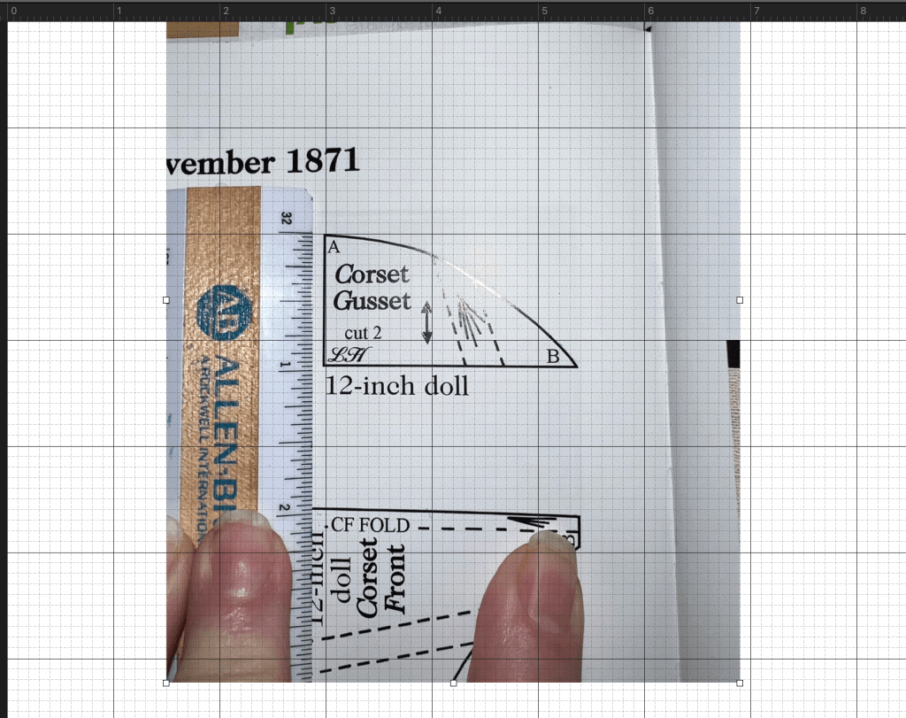 I then used a website to calculate the new measurements of the piece. Then, into Pixelmator Pro (there is a free version of Pixelmator available for Mac and you can find other similar apps for PC), I turned on the grid, placed the image and then enlarged it until the sides were the length I wanted. Print, cut out and hold up to the doll. On some pieces I made an additional paper towel mock up to verify sizing. When I felt confident the sizing was right, I traced out the pieces onto tissue paper. Was it a lot of work? Yes. Is it worth it? Also yes.
