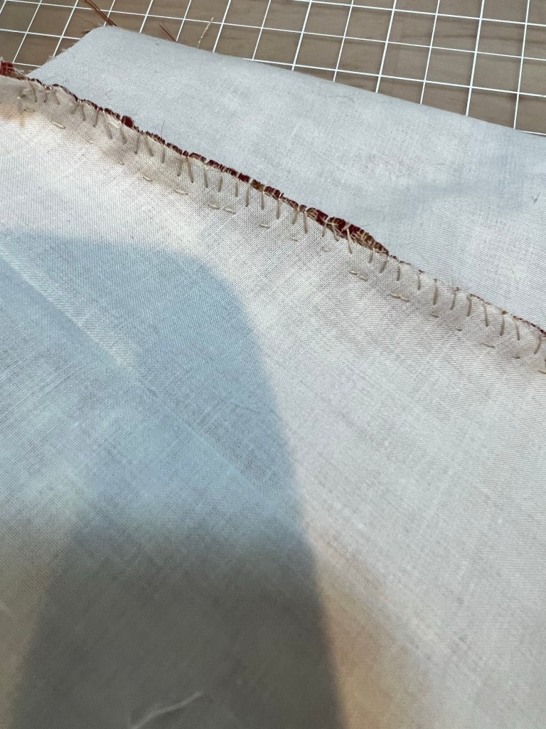The seams must be whipped to control the fray – either pressed open and whipped to the lining or whipped closed. On the lower hem, I chose to use bias tape as a facing to cut down on bulk. It has the added benefit of making it easier to curve the hem – it’s not straight – so it doesn’t ripple. If you used a lighter weight fabric you could easily make a standard hem. I also chose this fluted ribbon trim instead of pleats or fringe. It suits my style and Caroline likes it too.