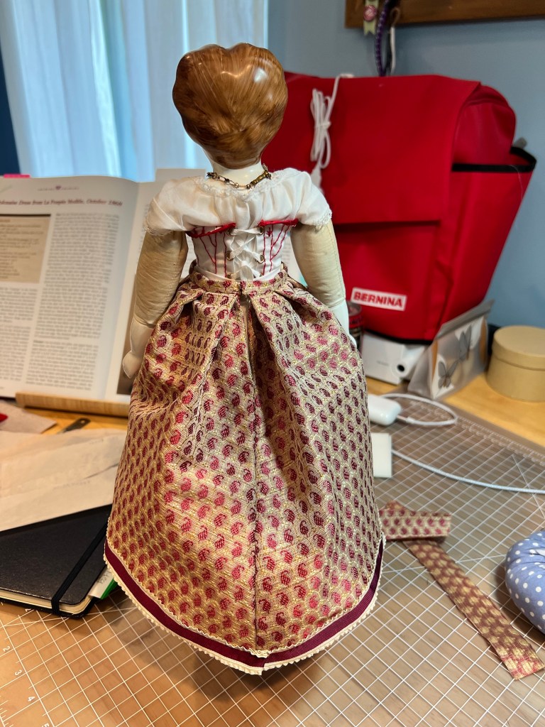 The skirt is a lovely silk brocade that I bought from a costuming friend a few years ago. The pattern is cranberry colored paisleys on a tan field with small golden threads shot through to frame the paisley motifs. I believe the pattern expected readers to use a lighter weight silk than this but I don’t thinks it is too much of a problem.