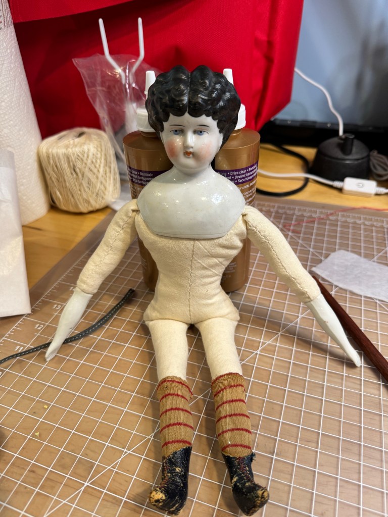 I’m tickled that I can share with you the new body created for Ruby. I was very happy to save her original stockings and shoes!