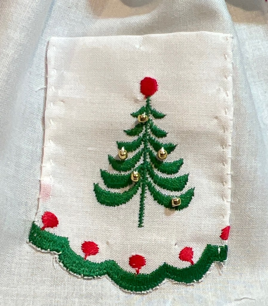 The work space is about 1 inch square. I tried to give the bell some dimension by taking the stitches from the edge to generally the center of the bell, then overlapping them. There’s probably a name for this method in needlework but I don’t know what it is. The stitches for the letters and the holly are about 2-3 threads long. The golden threads were unusual to work with as they don’t lay the same as a non-metallic thread would.