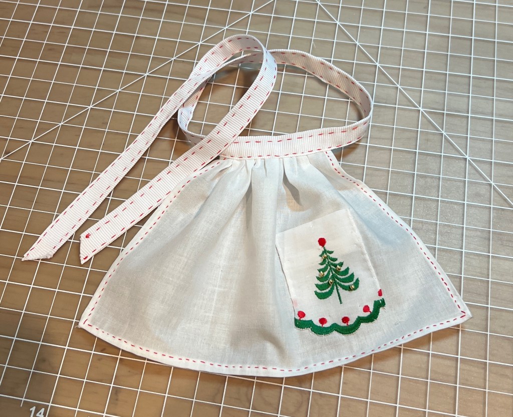 Attach the apron to the waistband, stitch and finish. For a really crisp look, starch the apron. I’m pleased with this little project. It took about two hours to complete and I expect one of my dolls to host a fancy dress party for the Yule season. Ok not really, but that’s a funny idea.