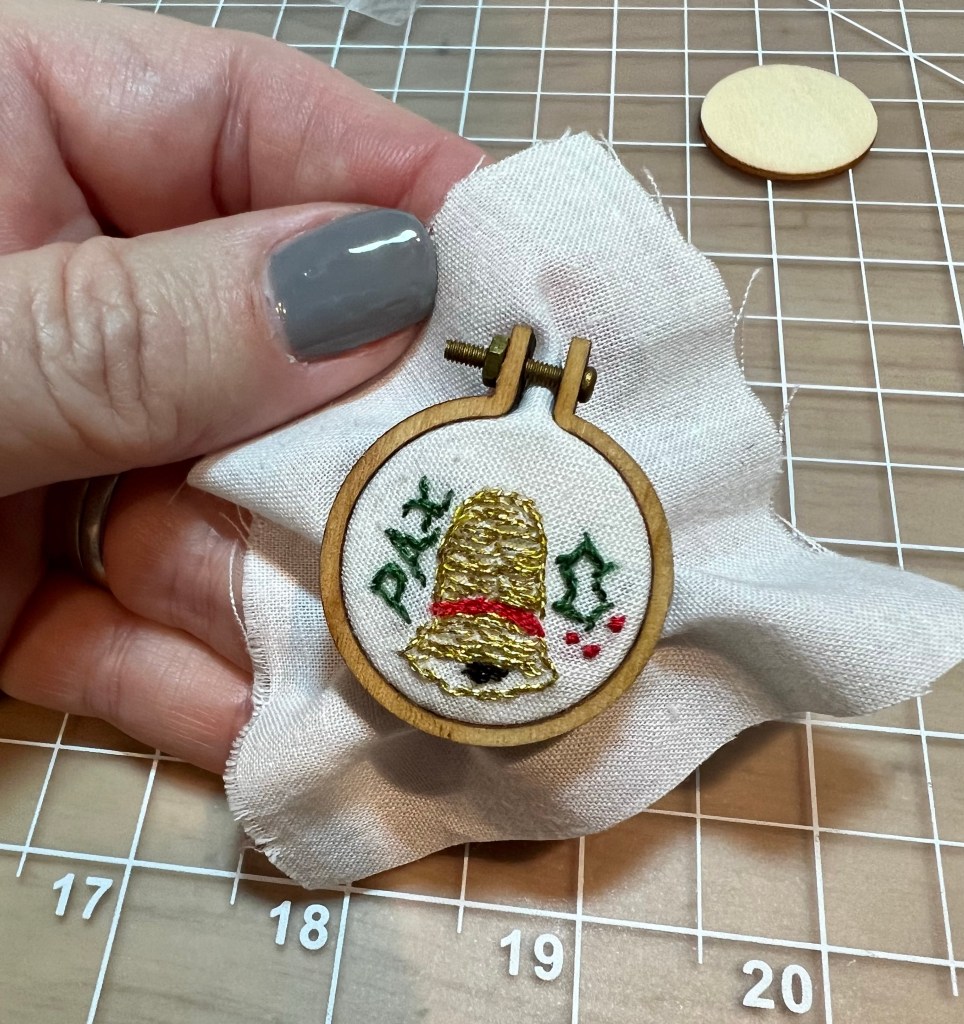 Because the hoop has a solid wooden back I padded the work with a piece of white cotton fabric to keep the wood color from showing through. I used tacky glue to hold down the backing, then again on the edge of the hoop.
