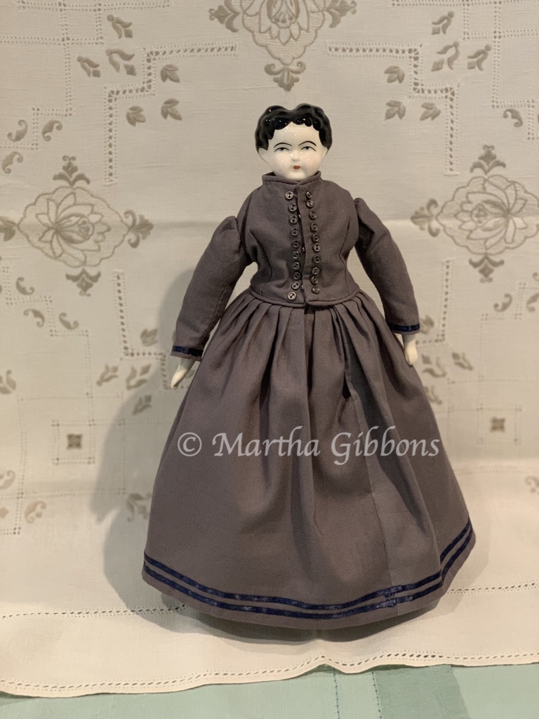 When I undertook this project, I knew I would need to do some customizing of the patterns in the book I am using. Many dolls, such as Huret dolls, are made all the same size & shape, and so easier to dress out of patterns for Huret dolls. This particular book features French fashion dolls of a different brand, but similar style – a fixed body size & shape. The user simply traces the pattern pieces, makes up the garments and voila, the doll has new clothing! But with other dolls, whether historical or modern reproductions, the bodies have been made by an individual consumer out of fabric and some kind of filling, while the head, hands and feet are porcelain. Each doll becomes customized by the skills (or lack of skill) of the creator. Whether inexpert, like my Sunbonnet Sue, or highly precise, like my Hannah, the doll bodies are unique. Sometimes, shoulders are wide, arms are fat, legs are skinny, etc. It is all dependent upon the person who created the doll, and while certainly, a single person might create numerous dolls from a single pattern and each is precisely created, more often than not in the collector market, doll bodies are not uniform.