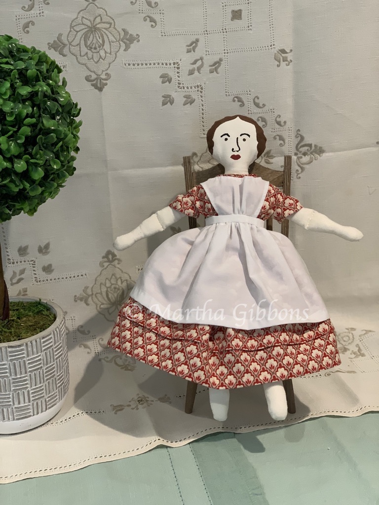 Many of my photos in previous posts were not the best. I always had the idea to make a “photo studio” similar to the set up of photograph studios in the 19th century. Using the portrait mode on my iPhone, I was able to make some nice images of these little ladies to show them off. I used a vintage tablecloth and a couple linen napkins for the drapery, a foam core presentation board for the backing; I found the topiary at Homegoods, the eucalyptus at Target and the chair at Michaels. All affordable items I have collected over time. In my mind, I pictured a few more things – like a table and a tiny photo album – but for now, I’m quite pleased with the results. I went back and re-photographed some of my dolls and took photos of some new garments for others. I hope you enjoy! Below you will find links to all of the dolls and their individual posts.