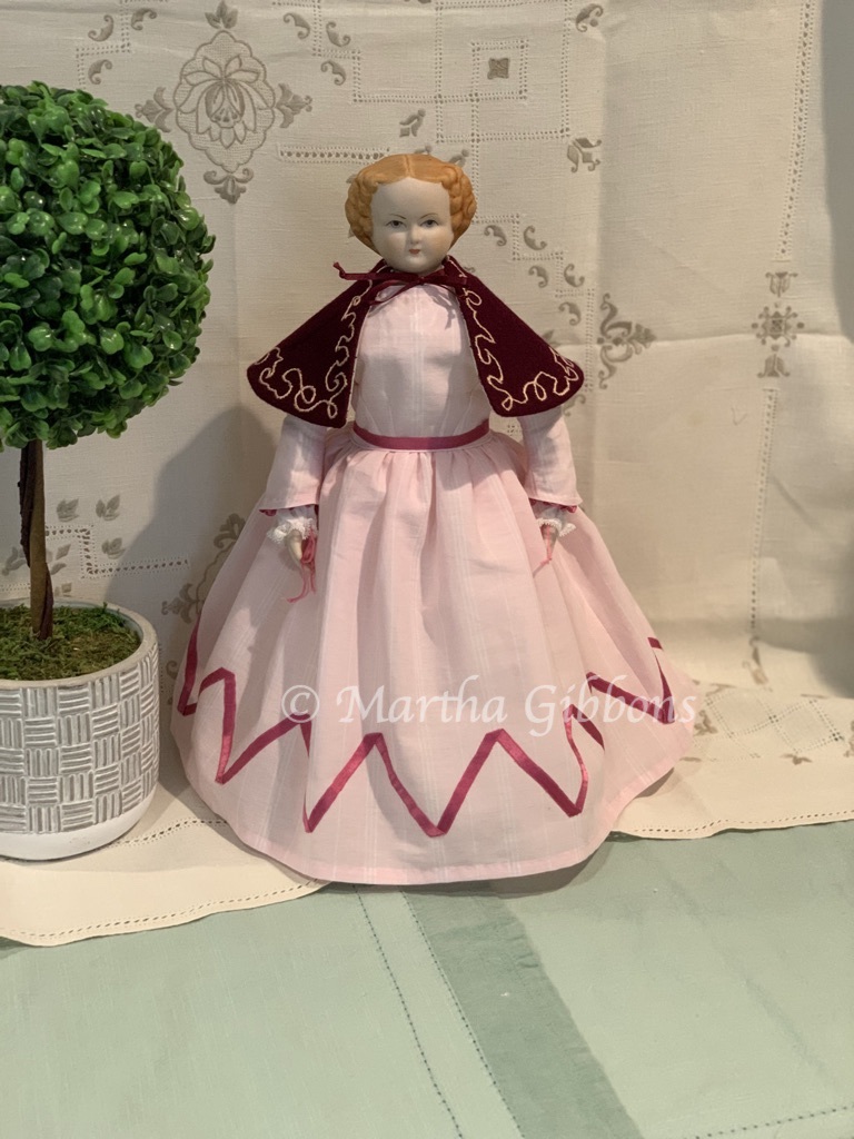 Mernie also got a new dress and a coat, plus a bonnet. The trim on this coat is handmade, 4-strand braid of embroidery floss. The bonnet is actually made from the pattern for the nightcap I made for Inez! It fits the little girl doll heads quite nicely, a bit better than the bonnet pattern that comes with the little girl patterns.