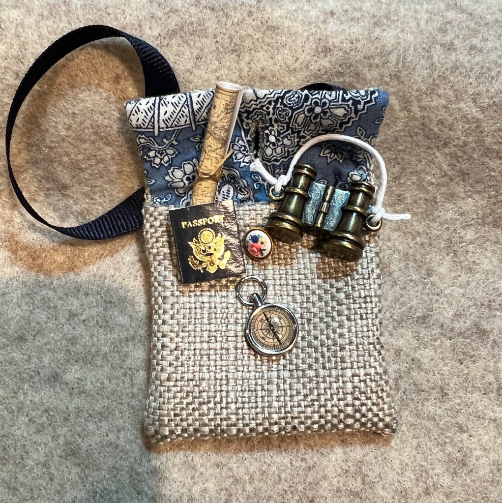 The satchel was inspired by the contents. I found these a while ago and they are just so cute. There is a compass, a map, a passport and binoculars.