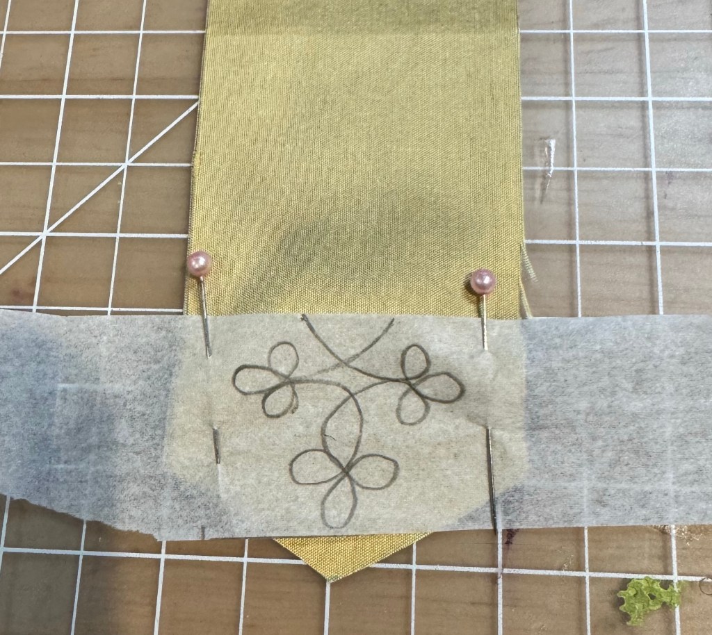 Pin that where you want your embroidery to be. Make sure to leave space for 1/8” seams on all three sides of this flap. Using 2 strands of your floss, stitch directly through the tissue paper and follow the pattern.