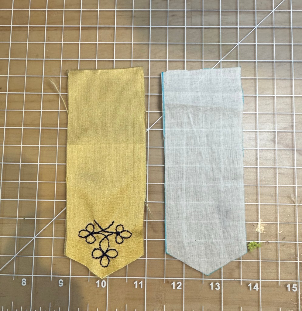 Begin by cutting one silk and one cotton piece 2 inches wide by 5 1/2” long. On one short end, make a point that is stepped back 1/2” from the end.