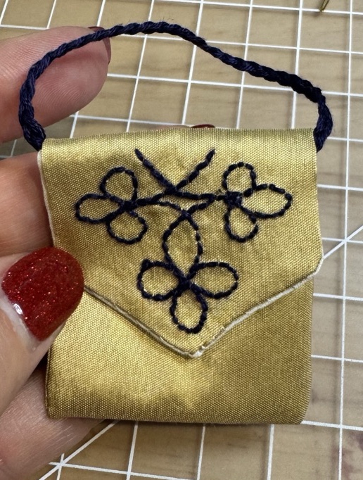 All the raw edges should be inside, the handle should be nicely secured. Finger press the flap closed so the embroidered side looks pretty. If you like you can add a hook & eye or snap. Depending on the embroidery you select you could make a buttonhole and add a decorative button.