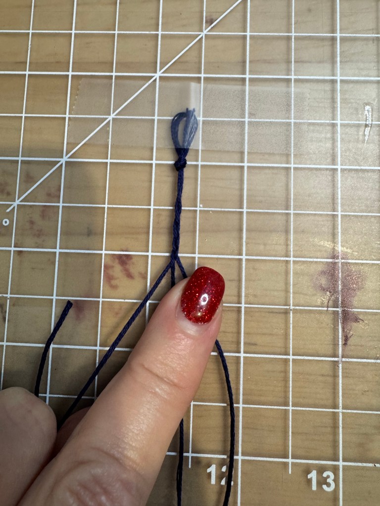 Measure out 24” of embroidery floss, then section that into three 8” strands. Knot one end, then tape it to your work surface. Braid the floss until you have 4 or 5” of braid. Knot the end and clip off the tail.