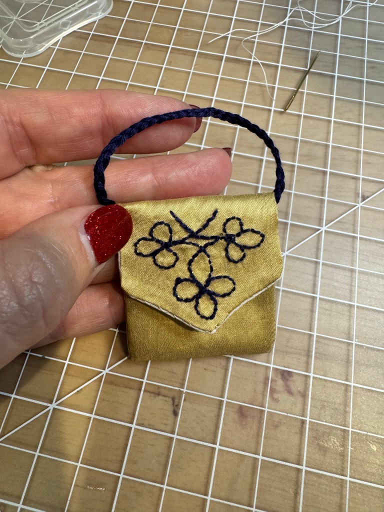 A proper Victorian lady doll must have a handbag for the various items she’d like to carry with her when visiting friends. Perhaps calling cards, a pencil, a coin and a house key might be needed during her day. I wanted to make Ruby a little handbag and devised this pretty one. You can make one too, just follow these easy instructions.