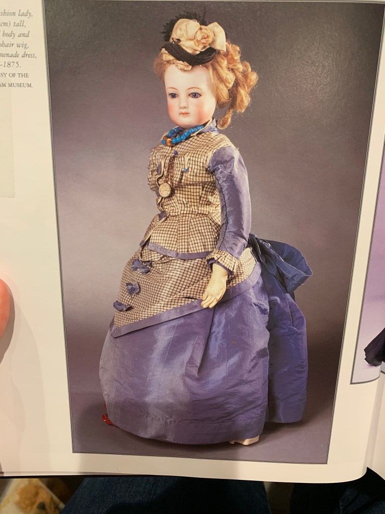 The photo on the left is an original doll made during the 1870s and featured in the book. She is truly lovely and I loved her bustle dress. The photo on the right is an extant dress from the same time period and was another inspiration for me. I had this French blue silk that I had bought years ago. Literally, I have been toting it around for three houses now, so it’s about time I used it. I also recently acquired some gorgeous gold silk taffeta from FarmhouseFabrics.com. They have a great selection of heirloom quality goods, plus they have doll “kits” of fabric and trims in coordinated colors. The gold silk taffeta came from one of those kits.