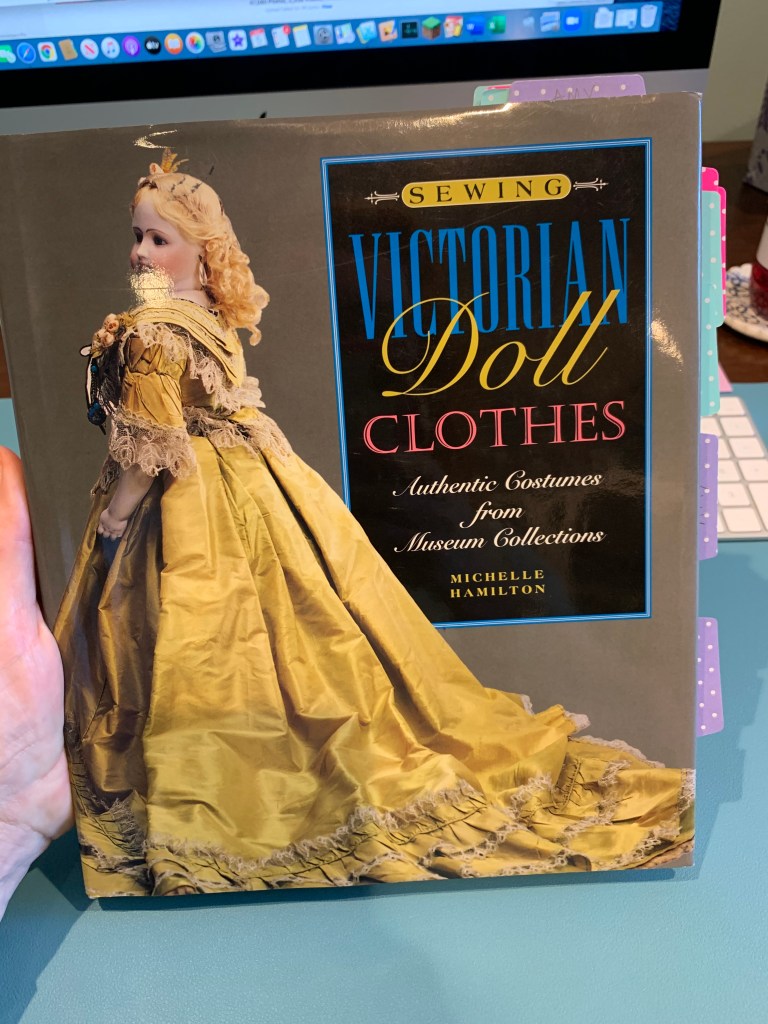 I don’t think you need a picture of Hannah in her underclothes – at this point, dolls in chemises, underbodices, or drawers is just redundant, don’t you think? Suffice to say I used the underbodice & drawers patterns from the 1875 La Mode Illustree that I mentioned in my last post about Emma, and the underbodice fits Hannah much better than Emma’s does. A while back, I picked up a copy of Sewing Victorian Doll Clothes by Michelle Hamilton. This lovely book covers 1840 through 1910, and includes not only a study of the various doll styles available during that timespan, but also some well designed and detailed patterns. The tricky thing is that to make the patterns fit in the book, they have to be printed quite small, and then the user was intended to enlarge the pattern on a copy machine. Since I don’t have a copy machine handy, but I do have a scanner, I went with that method, heh. You can see in the picture all the tabs I have added to this resource – I have a lot of plans for my dolls!